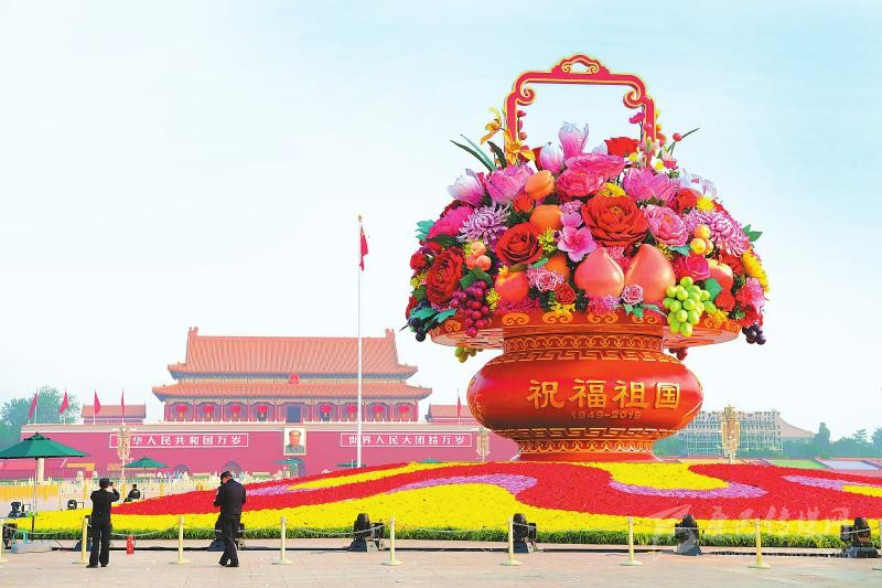 記者從北京市園林綠化局獲悉,今年的天安門廣場主體花壇延續(xù)了群眾喜聞樂見的“花果籃”造型,以紅色和黃色為主色調(diào),花壇頂高18米,籃體高16米,籃盤直徑12米,花壇底部直徑45米。籃體南側(cè)書寫 “祝福祖國,1949-2019”字樣,籃體北側(cè)書寫“普天同慶,1949-2019”字樣。