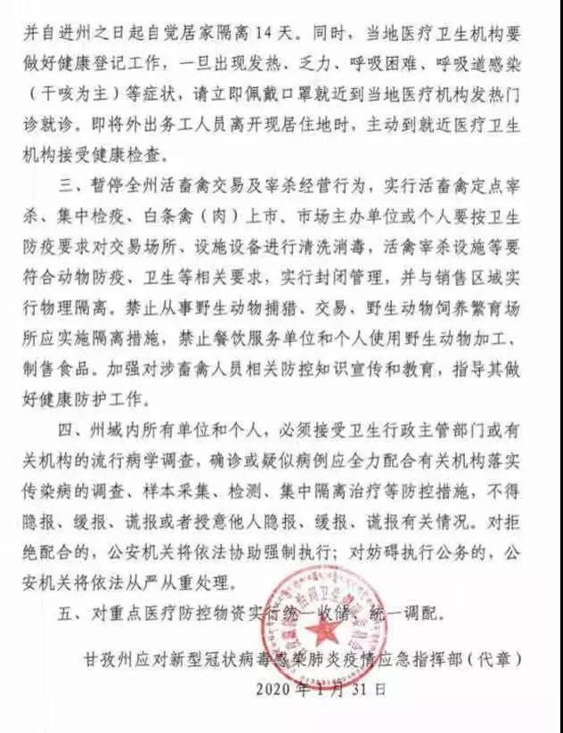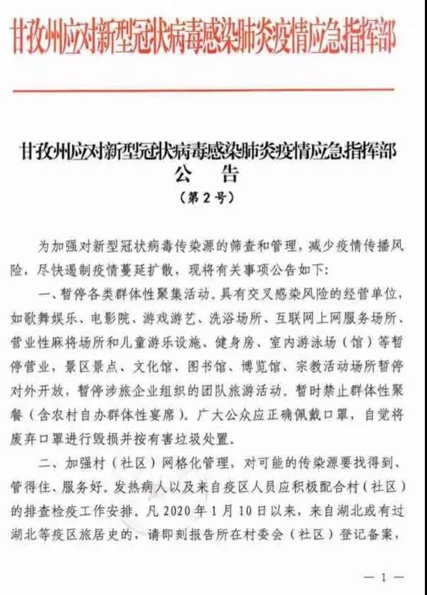 一、暫停各類群體性聚集活動。具有交叉感染風(fēng)險的經(jīng)營單位,如歌舞娛樂、電影院、游戲游藝、洗浴場所、互聯(lián)網(wǎng)上網(wǎng)服務(wù)場所、營業(yè)性麻將場所和兒童游樂設(shè)施、健身房、室內(nèi)游泳場(館)等暫停營業(yè),景區(qū)景點(diǎn)、文化館、圖書館、博覽館、宗教活動場所暫停對外開放,暫停涉旅企業(yè)組織的團(tuán)隊(duì)旅游活動。暫時禁止群體性聚餐(含農(nóng)村自辦群體性宴席)。廣大公眾應(yīng)正確佩戴口罩,自覺將廢棄口罩進(jìn)行毀損并按有害垃圾處置。二、加強(qiáng)村(社區(qū))網(wǎng)格化管理,對可能的傳染源要找得到、管得住、服務(wù)好。發(fā)熱病人以及來自疫區(qū)人員應(yīng)積極配合村(社區(qū))的排查檢疫工作安排。凡2020年1月10日以來,來自湖北或有過湖北等疫區(qū)旅居史的,請即刻報告所在村委會(社區(qū))登記備案,并自進(jìn)州之日起自覺居家隔離14天。同時,當(dāng)?shù)蒯t(yī)療衛(wèi)生機(jī)構(gòu)要做好健康登記工作,一旦出現(xiàn)發(fā)熱、乏力、呼吸困難、呼吸道感染(干咳為主)等癥狀,請立即佩戴口罩就近到當(dāng)?shù)蒯t(yī)療機(jī)構(gòu)發(fā)熱門診就診。即將外出務(wù)工人員離開現(xiàn)居住地時,主動到就近醫(yī)療衛(wèi)生機(jī)構(gòu)接受健康檢查。三、暫停全州活畜禽交易及宰殺經(jīng)營行為,實(shí)行活畜禽定點(diǎn)宰殺、集中檢疫、白條禽(肉)上市。市場主辦單位或個人要按衛(wèi)生防疫要求對交易場所、設(shè)施設(shè)備進(jìn)行清洗消毒,活禽宰殺設(shè)施等要符合動物防疫、衛(wèi)生等相關(guān)要求,實(shí)行封閉管理,并與銷售區(qū)域?qū)嵭形锢砀綦x。禁止從事野生動物捕獵、交易,野生動物飼養(yǎng)繁育場所應(yīng)實(shí)施隔離措施,禁止餐飲服務(wù)單位和個人使用野生動物加工、制售食品。加強(qiáng)對涉畜禽人員相關(guān)防控知識宣傳和教育,指導(dǎo)其做好健康防護(hù)工作。四、州域內(nèi)所有單位和個人,必須接受衛(wèi)生行政主管部門或有關(guān)機(jī)構(gòu)的流行病學(xué)調(diào)查,確診或疑似病例應(yīng)全力配合有關(guān)機(jī)構(gòu)落實(shí)傳染病的調(diào)查、樣本采集、檢測、集中隔離治療等防控措施,不得隱報、緩報、謊報或者授意他人隱報、緩報、謊報有關(guān)情況。對拒絕配合的,公安機(jī)關(guān)將依法協(xié)助強(qiáng)制執(zhí)行;對妨礙執(zhí)行公務(wù)的,公安機(jī)關(guān)將依法從嚴(yán)從重處理。五、對重點(diǎn)醫(yī)療防控物資實(shí)行統(tǒng)一收儲、統(tǒng)一調(diào)配。甘孜州應(yīng)對新型冠狀病毒感染肺炎疫情應(yīng)急指揮部