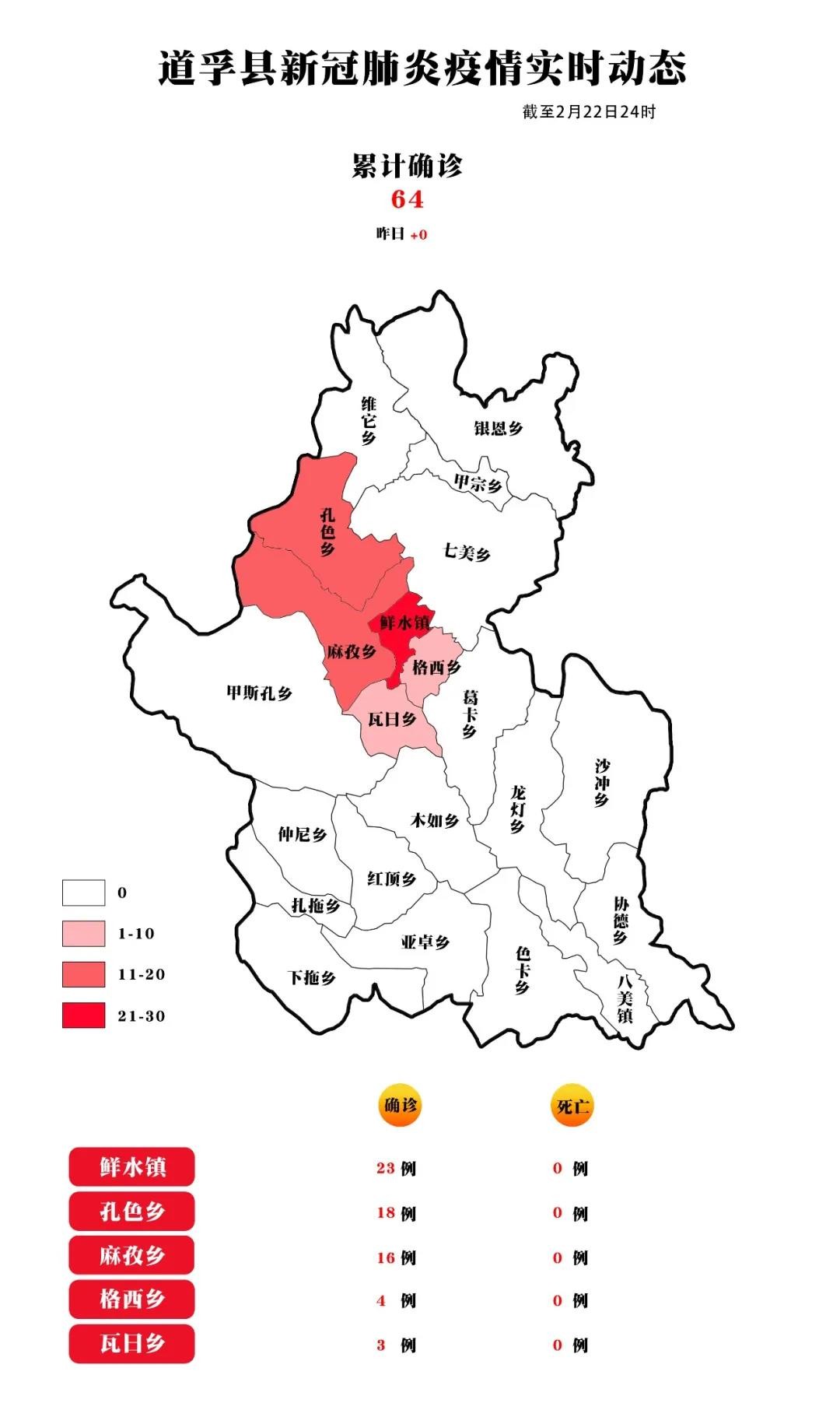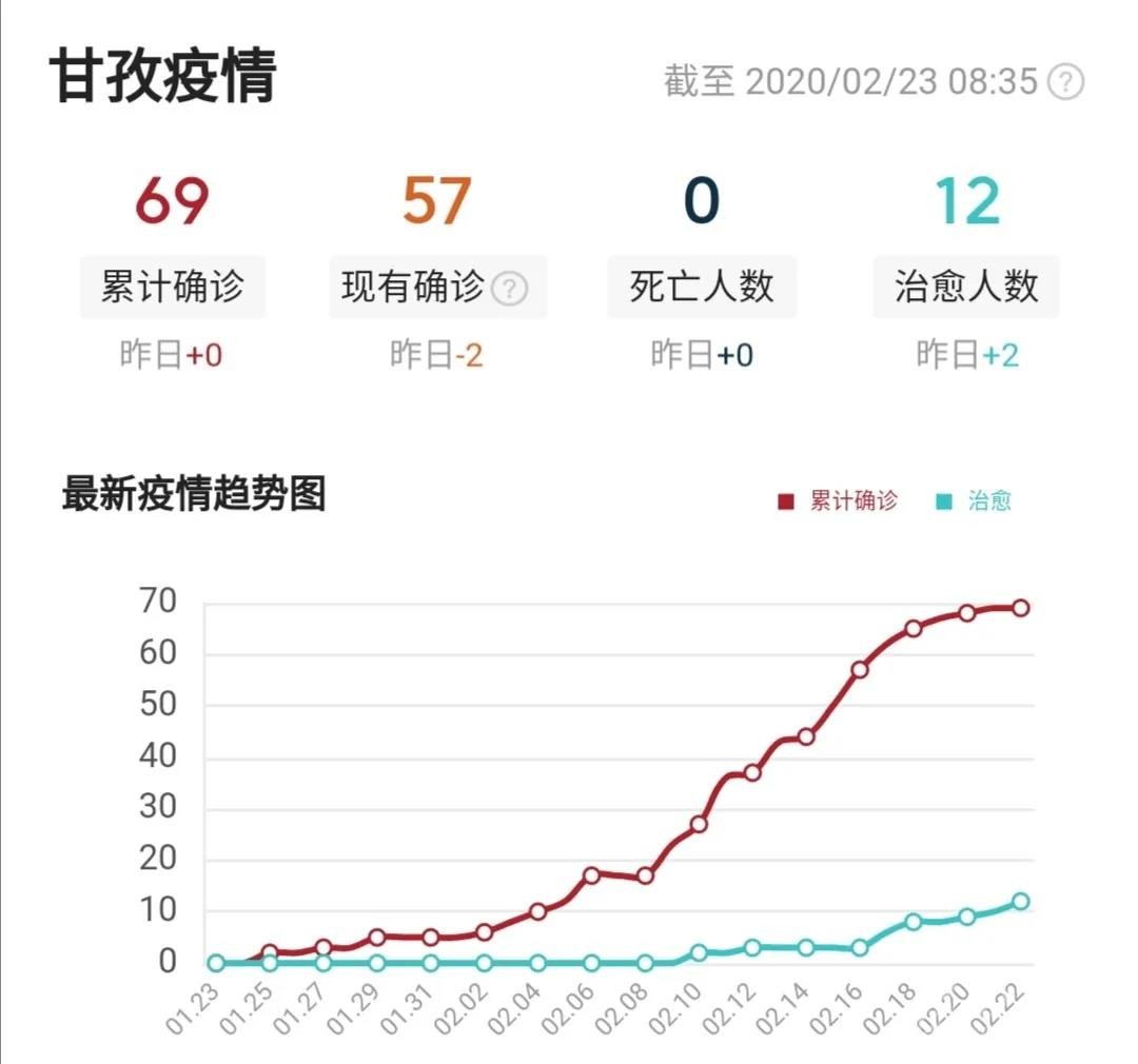 截止2月22日24時(shí),我州累計(jì)報(bào)告新型冠狀病毒肺炎確診病例69例(道孚64例、康定2例、色達(dá)2例、稻城1例),其中治愈出院12例,在治重癥5例,危重癥1例,其余患者病情穩(wěn)定,均在定點(diǎn)醫(yī)院接受治療。其中,男性39例,女性30例,最大的77歲,最小的3歲。