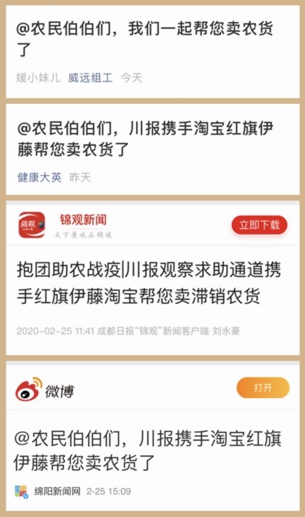 多地市州媒體及縣級融媒體中心的關(guān)注積極響應(yīng)參與活動?!熬W(wǎng)信四川”公眾號、南充日報“南充見”、成都日報錦觀、眉山在線、開江發(fā)布、直播鹽亭、綿陽新聞網(wǎng)、宜賓日報、威遠(yuǎn)組工、健康大英等均及時對活動相關(guān)信息進(jìn)行了發(fā)布,及時把抱團(tuán)助農(nóng)戰(zhàn)疫活動信息帶給當(dāng)?shù)赜行枨蟮霓r(nóng)戶。