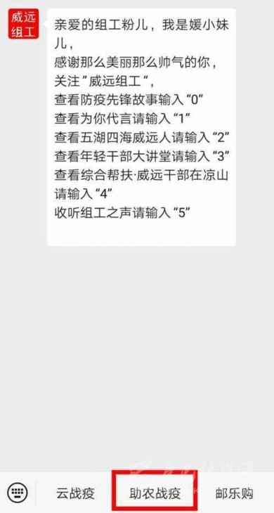 除了媒體之外,一些機(jī)關(guān)單位的政務(wù)新媒體也為活動“站臺”,“威遠(yuǎn)組工”官方微信公眾號的底部菜單欄,特別新增了“助農(nóng)戰(zhàn)疫”專欄,直接連通川報觀察頁面,為當(dāng)?shù)剞r(nóng)戶及農(nóng)業(yè)經(jīng)營戶提供解決難題的路徑。