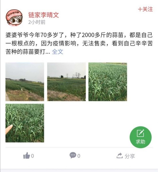 “婆婆爺爺今年70多歲了,種了2000多斤的蒜苗,都是自己一根根點(diǎn)的,因?yàn)橐咔橛绊?,無法售賣,看到自己辛辛苦苦種的蒜苗要打水漂,兩個老人都要急哭了。”家住成都彭州市的李小姐通過“抱團(tuán)助農(nóng)戰(zhàn)疫”平臺求助表示,希望能夠幫忙盡快處理這些蒜苗。