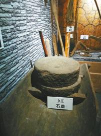 三河村村史館內陳列的吊鍋、石磨和彝族漆器等生活用具。