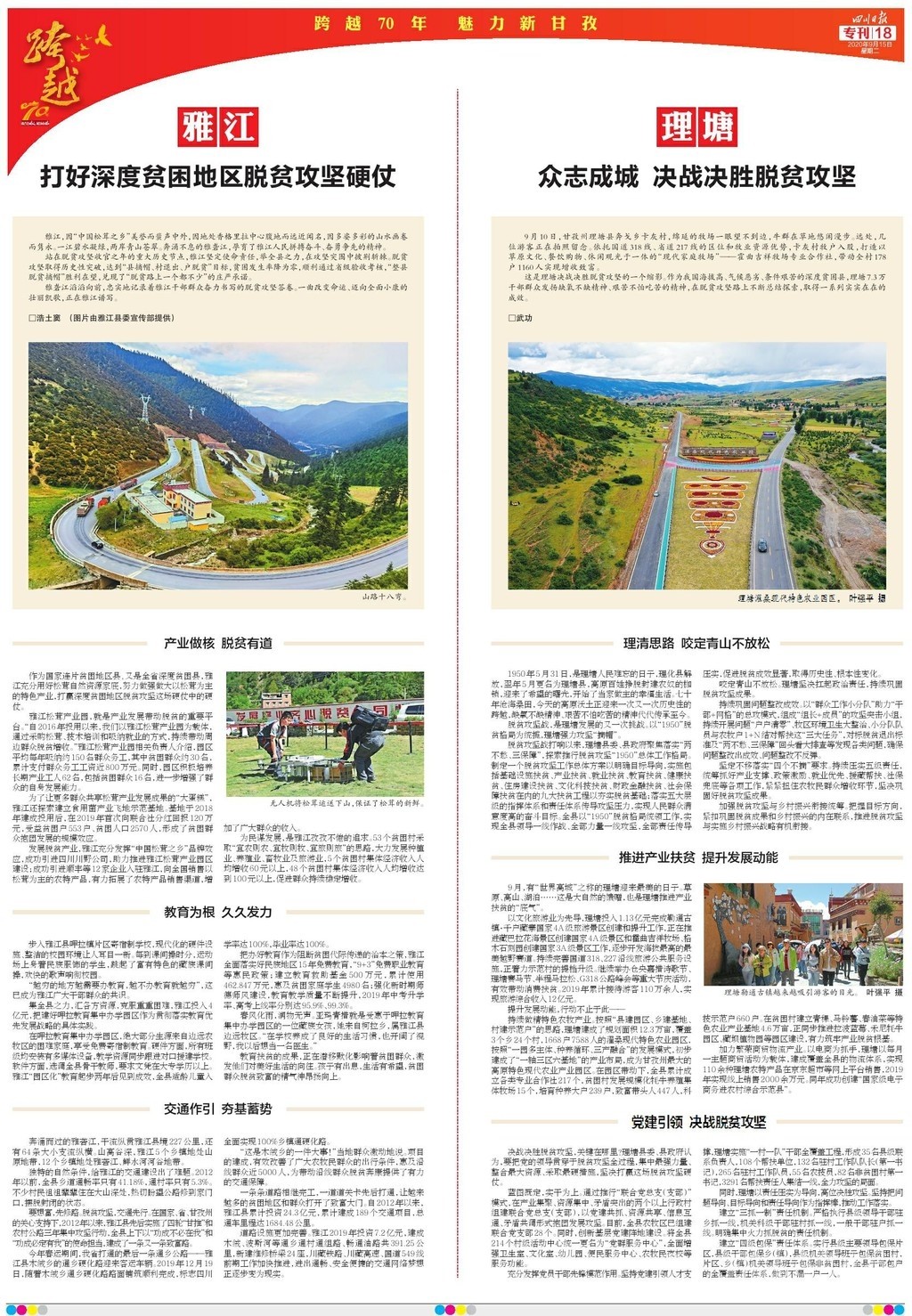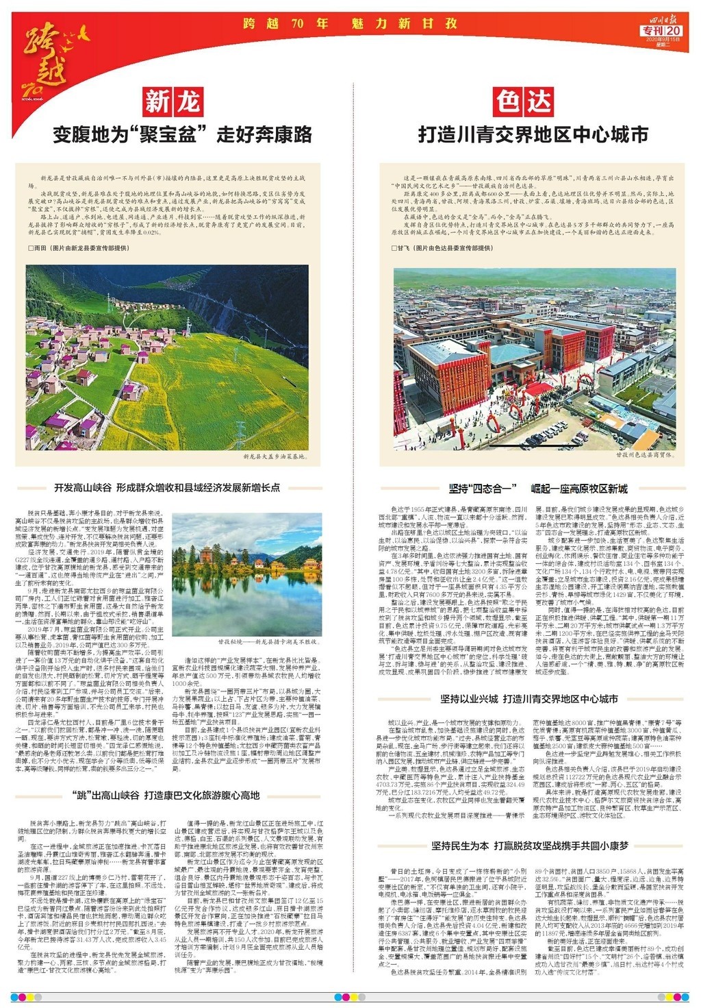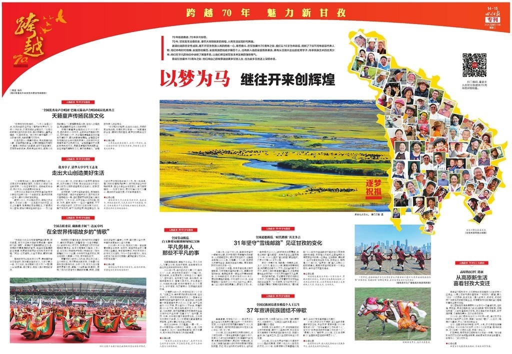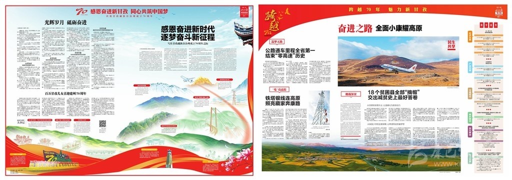 為慶祝甘孜建州70周年,《四川日?qǐng)?bào)》于9月15日推出八連版特別報(bào)道,整體以紅色打底,充滿喜慶的祝福。