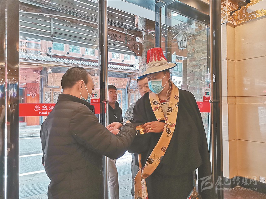 色達縣演出隊入住邦金麥朵酒店。每天,酒店安保人員多扎準時出現(xiàn)在門口,提醒演職人員測量體溫、佩戴口罩。“我是酒店的第一關卡,拉姆是第二關,我倆相互配合,表演節(jié)目的客人住得放心,演出的節(jié)目才會更加精彩。”拿著體溫槍,多扎一臉自豪地說。