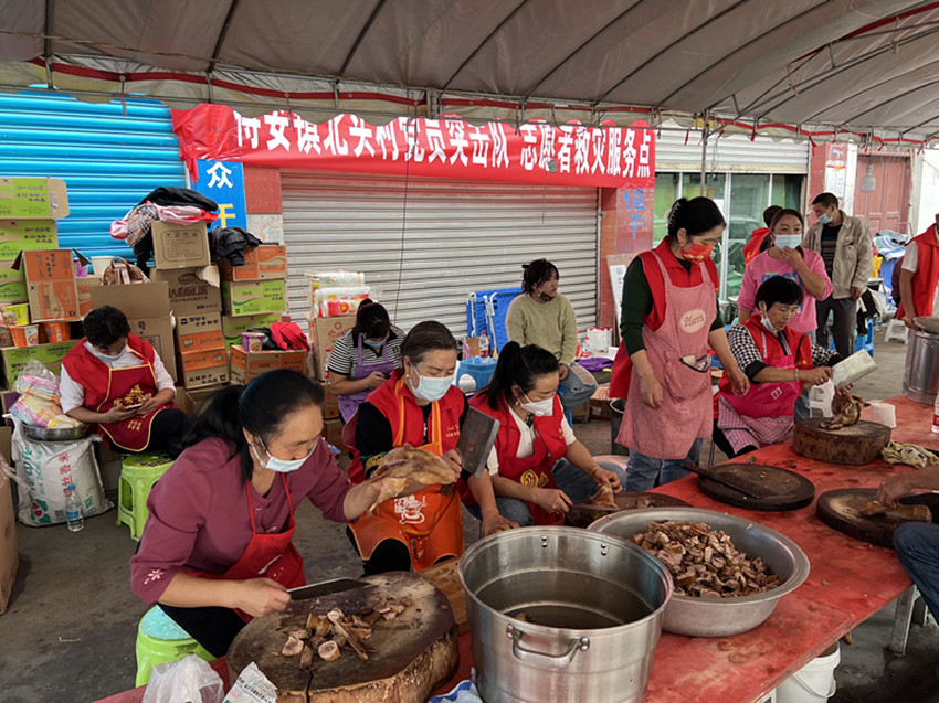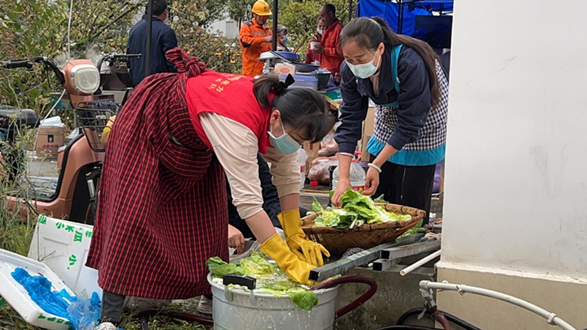 在得妥鎮(zhèn)北頭村的路旁,來自瀘定縣冷磧鎮(zhèn)桐子林村的李星芳和其他志愿者一起忙著切菜煮飯。她告訴記者,地震發(fā)生后,我主動報(bào)名加入志愿者團(tuán)隊(duì)?!拔覀冞@個(gè)點(diǎn)上除了政府發(fā)放的物資,還有很多附近村民和好心人送來的菜肉和水果,大家都在用自己的行動出一份力?!闭诿χ胁说闹驹刚吆樾l(wèi)群說。就在記者采訪時(shí),在北頭村開飯館的易姝宏一家送來了鹵菜、排骨和新鮮蔬菜,記賬員茍有成忙著清點(diǎn)數(shù)量并記錄在冊?!暗卣鸷?,爸媽把年邁的奶奶送到瀘定縣城孃孃家,我也向單位請了假,今天我們一起趕回來在這里幫忙”。