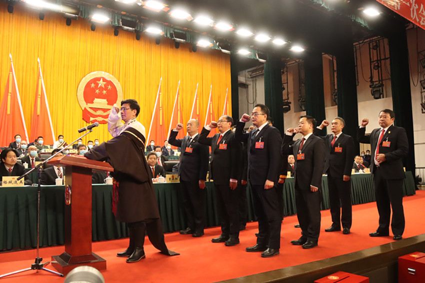 州十三屆人大一次會議上,當(dāng)選的州政府班子成員和州監(jiān)察委員會主任、州中級人民法院院長向憲法宣誓。