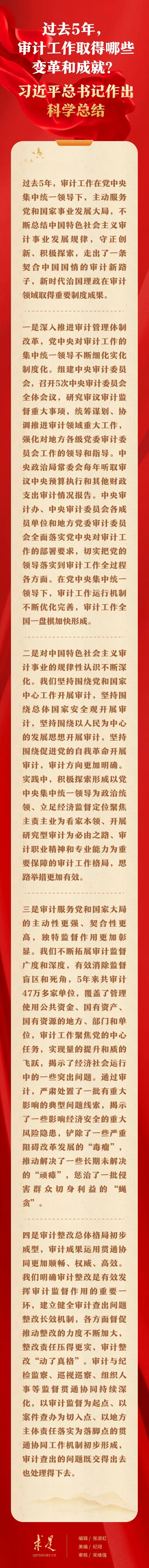 11月1日出版的第21期《求是》雜志刊發(fā)習(xí)近平總書記重要文章《在二十屆中央審計委員會第一次會議上的講話》。在這篇重要文章中,習(xí)近平總書記從4個方面對過去5年的審計工作進行科學(xué)總結(jié),強調(diào):“審計工作取得的這些變革和成就,是新時代中國特色社會主義思想在審計領(lǐng)域的具體實踐,彰顯了黨的創(chuàng)新理論的真理力量,具有鮮明的時代性和實踐性。要總結(jié)好、運用好黨關(guān)于新時代審計工作的理論成果和實踐成果,長期堅持并不斷豐富發(fā)展,指導(dǎo)審計工作實現(xiàn)更大作為?!?/p>