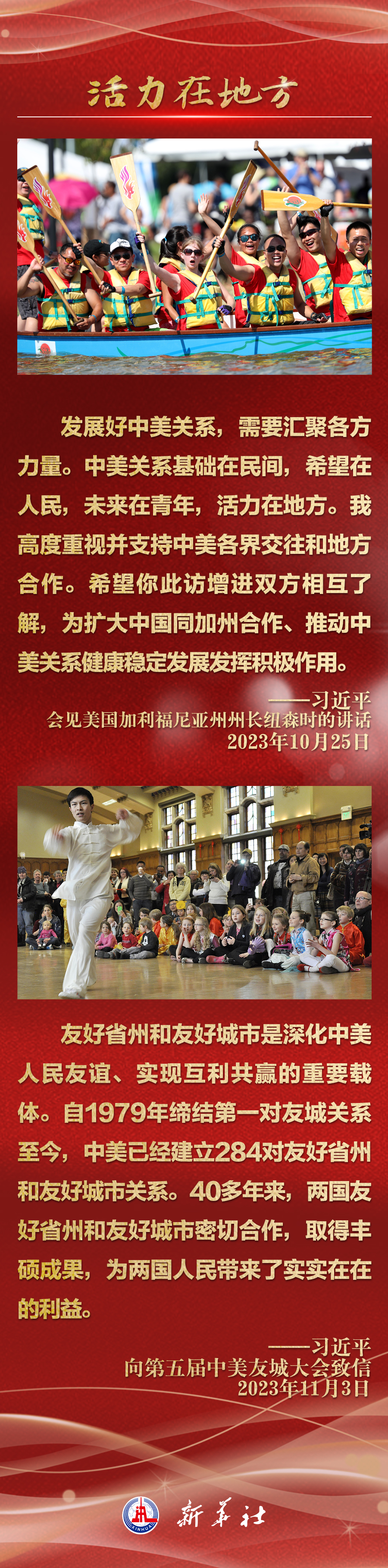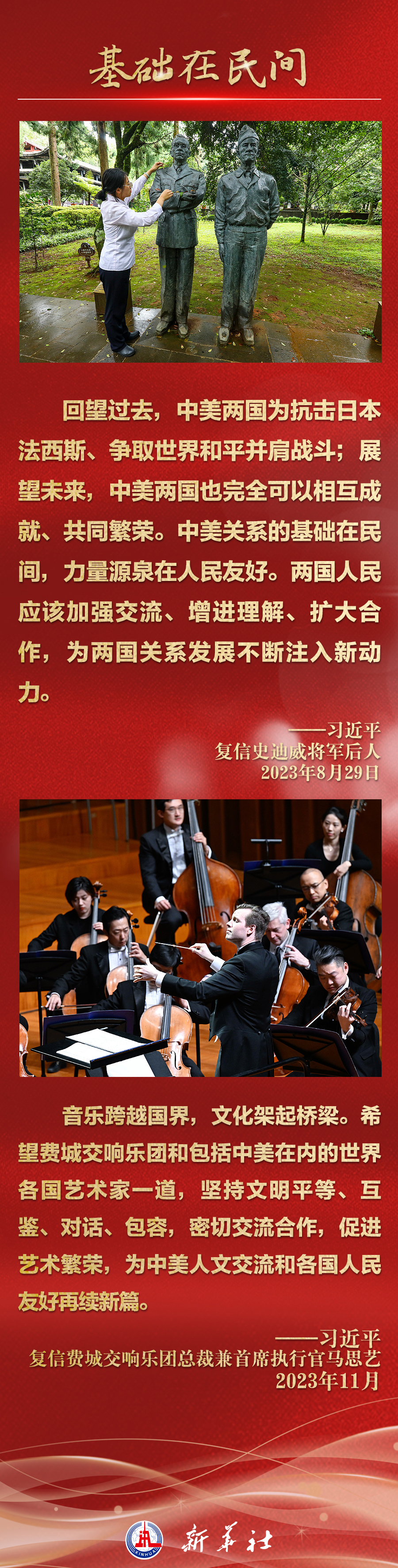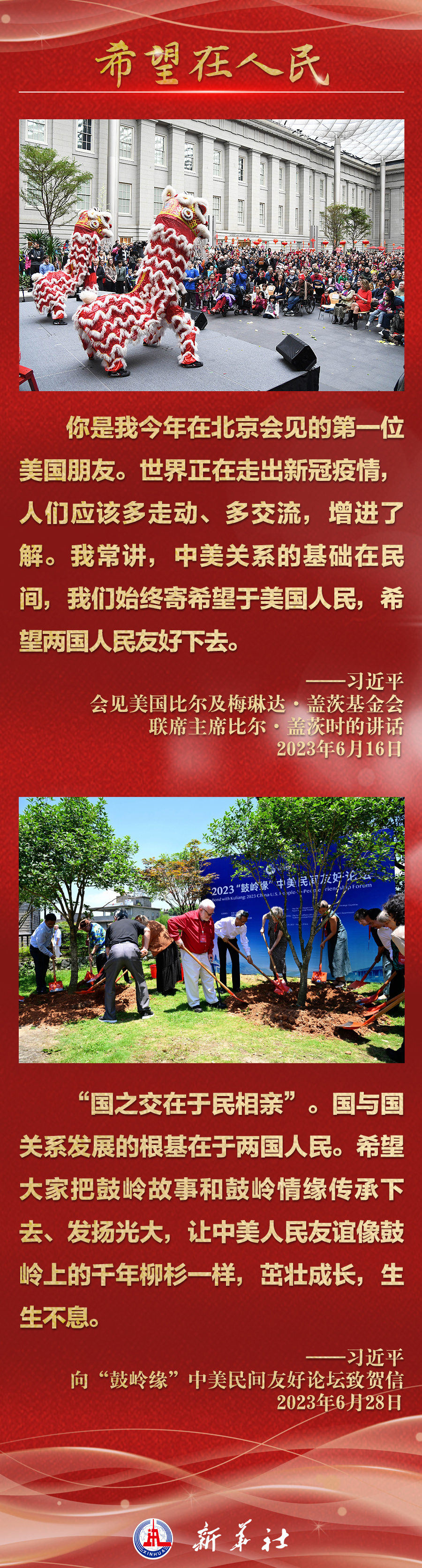 今年以來,從在京會(huì)見美國(guó)各界人士,到向“鼓嶺緣”中美民間友好論壇等活動(dòng)致賀信,再到復(fù)信美國(guó)華盛頓州“美中青少年學(xué)生交流協(xié)會(huì)”、史迪威將軍后人、飛虎隊(duì)老兵等友好人士,習(xí)近平主席同美國(guó)各界真摯互動(dòng),強(qiáng)調(diào)中美關(guān)系基礎(chǔ)在民間,希望在人民,未來在青年,活力在地方。