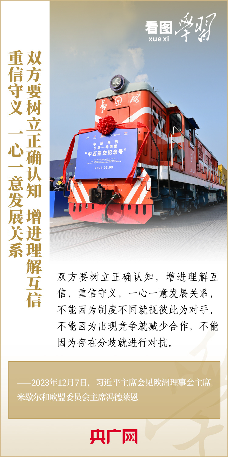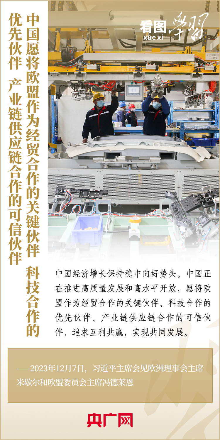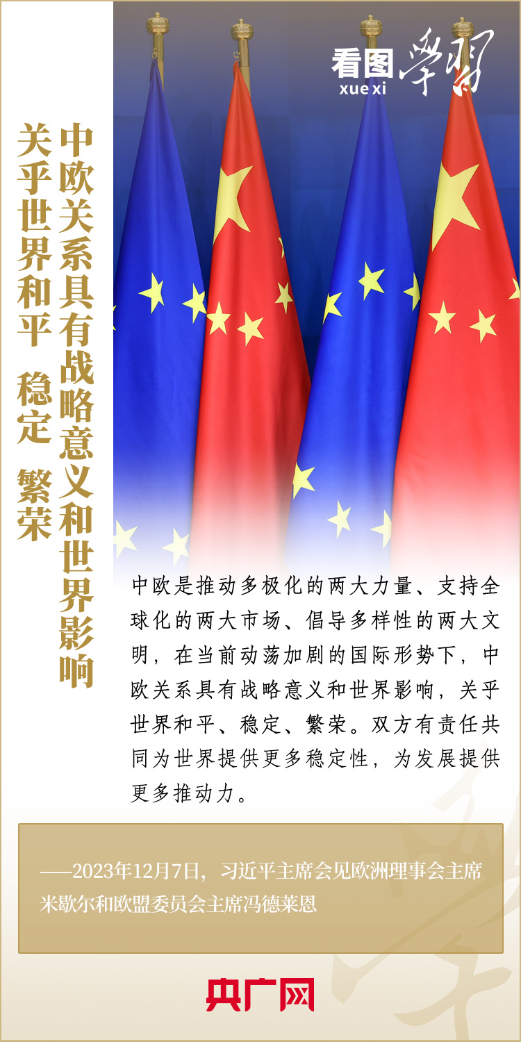 12月7日,國家主席習(xí)近平會見來華舉行第二十四次中國—?dú)W盟領(lǐng)導(dǎo)人會晤的歐洲理事會主席米歇爾和歐盟委員會主席馮德萊恩,雙方就事關(guān)中歐關(guān)系的戰(zhàn)略性問題,以及中歐各領(lǐng)域?qū)υ捄献鳌㈦p方重點(diǎn)關(guān)切、全球治理、國際和地區(qū)熱點(diǎn)問題等深入坦誠交換看法,并就一系列問題達(dá)成重要共識。今年是中歐建立全面戰(zhàn)略伙伴關(guān)系20周年,習(xí)主席強(qiáng)調(diào),中歐關(guān)系具有戰(zhàn)略意義和世界影響,關(guān)乎世界和平、穩(wěn)定、繁榮。一起來學(xué)習(xí)!