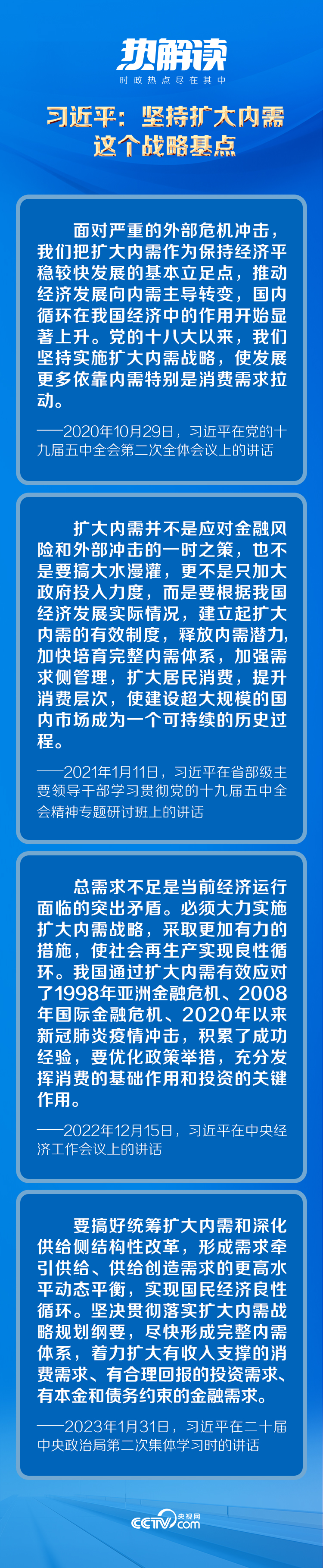 黨的十八大以來,習(xí)近平總書記從我國(guó)經(jīng)濟(jì)運(yùn)行的實(shí)際出發(fā),對(duì)擴(kuò)大內(nèi)需作出了一系列重要論述,為實(shí)施擴(kuò)大內(nèi)需戰(zhàn)略提供了科學(xué)指引。