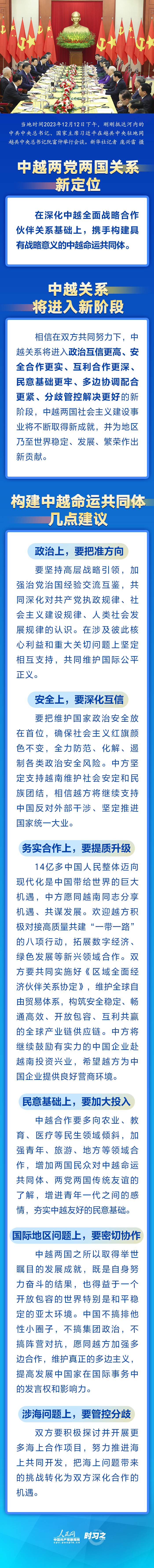 當?shù)貢r間2023年12月12日下午,剛剛抵達河內(nèi)的中共中央總書記、國家主席習近平在越共中央駐地同越共中央總書記阮富仲舉行會談。雙方宣布中越兩黨兩國關(guān)系新定位,在深化中越全面戰(zhàn)略合作伙伴關(guān)系基礎(chǔ)上,攜手構(gòu)建具有戰(zhàn)略意義的中越命運共同體。