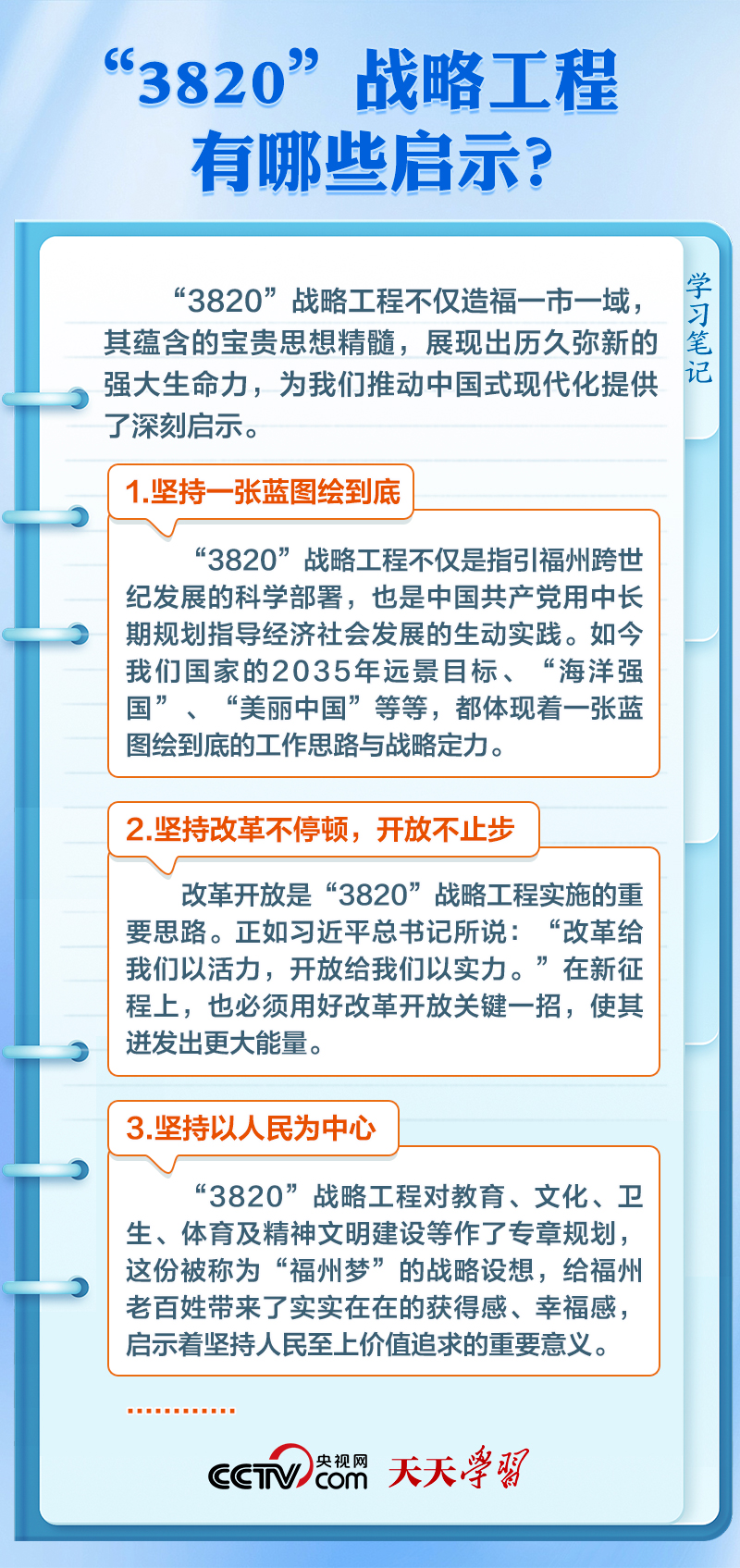 天天學(xué)習(xí)上世紀(jì)90年代,習(xí)近平在福州工作期間,親自主持編制了《福州市20年經(jīng)濟社會發(fā)展戰(zhàn)略設(shè)想》(簡稱“3820”戰(zhàn)略工程),系統(tǒng)謀劃了福州3年、8年、20年經(jīng)濟社會發(fā)展的目標(biāo)、步驟、布局、重點等,為福州擘畫了美好藍(lán)圖,確立了總綱領(lǐng)、總方略。