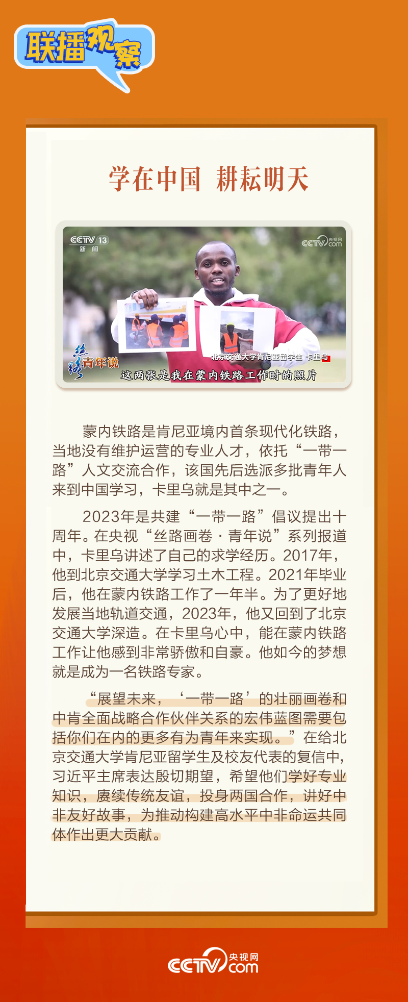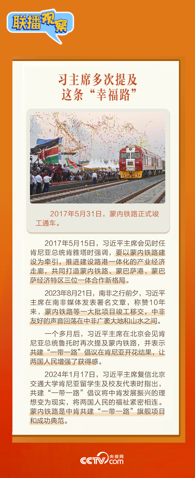 聯(lián)播+日前,北京交通大學肯尼亞留學生及校友代表致信習近平主席,表示非常高興來到中國學習鐵路運營管理知識。1月17日,習近平主席復信表達欣慰和喜悅之情,“蒙內(nèi)鐵路是中肯共建‘一帶一路’旗艦項目和成功典范。我高興地看到,你們因這條‘幸福路’與中國結緣……”
