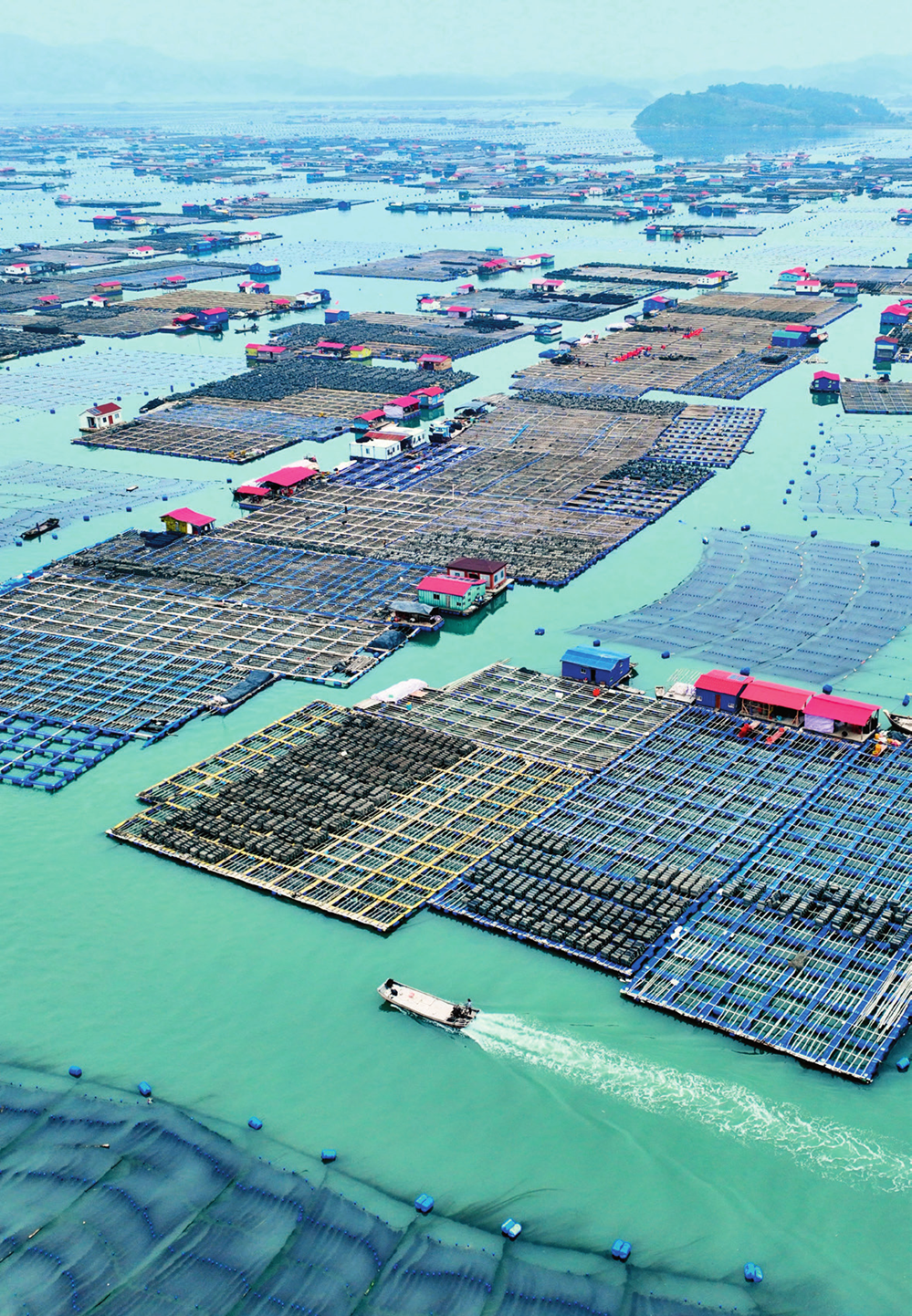 ??晨光灑在海面,萬頃碧波間,一列列網(wǎng)箱如同阡陌縱橫的海上農(nóng)田,色澤金黃的大黃魚悠然歡游,穿梭其間的漁民們徜徉在“金黃色的美夢(mèng)”中。