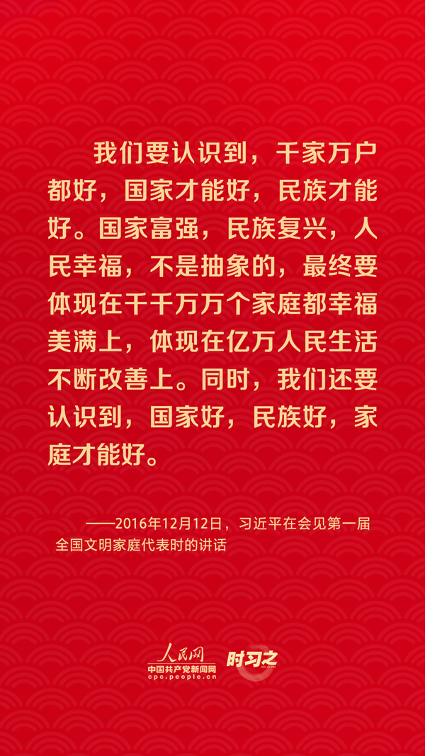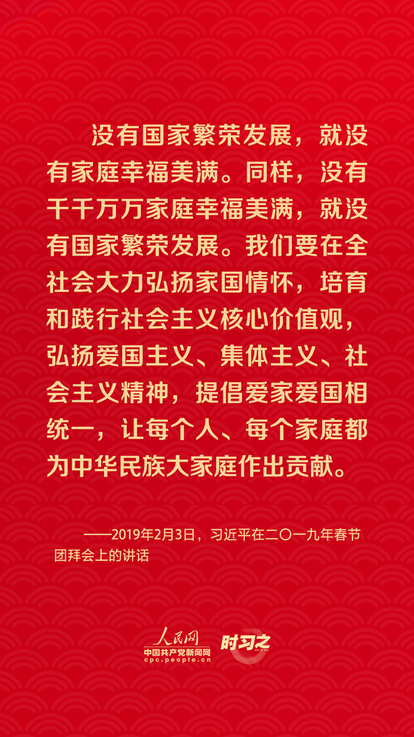 團圓是春節(jié)永恒的主題?!皼]有國家繁榮發(fā)展,就沒有家庭幸福美滿。同樣,沒有千千萬萬家庭幸福美滿,就沒有國家繁榮發(fā)展。”習近平總書記曾在多個場合深刻闡述家庭與國家之間的關系,從他的話語里一起感悟深厚的家國情懷。