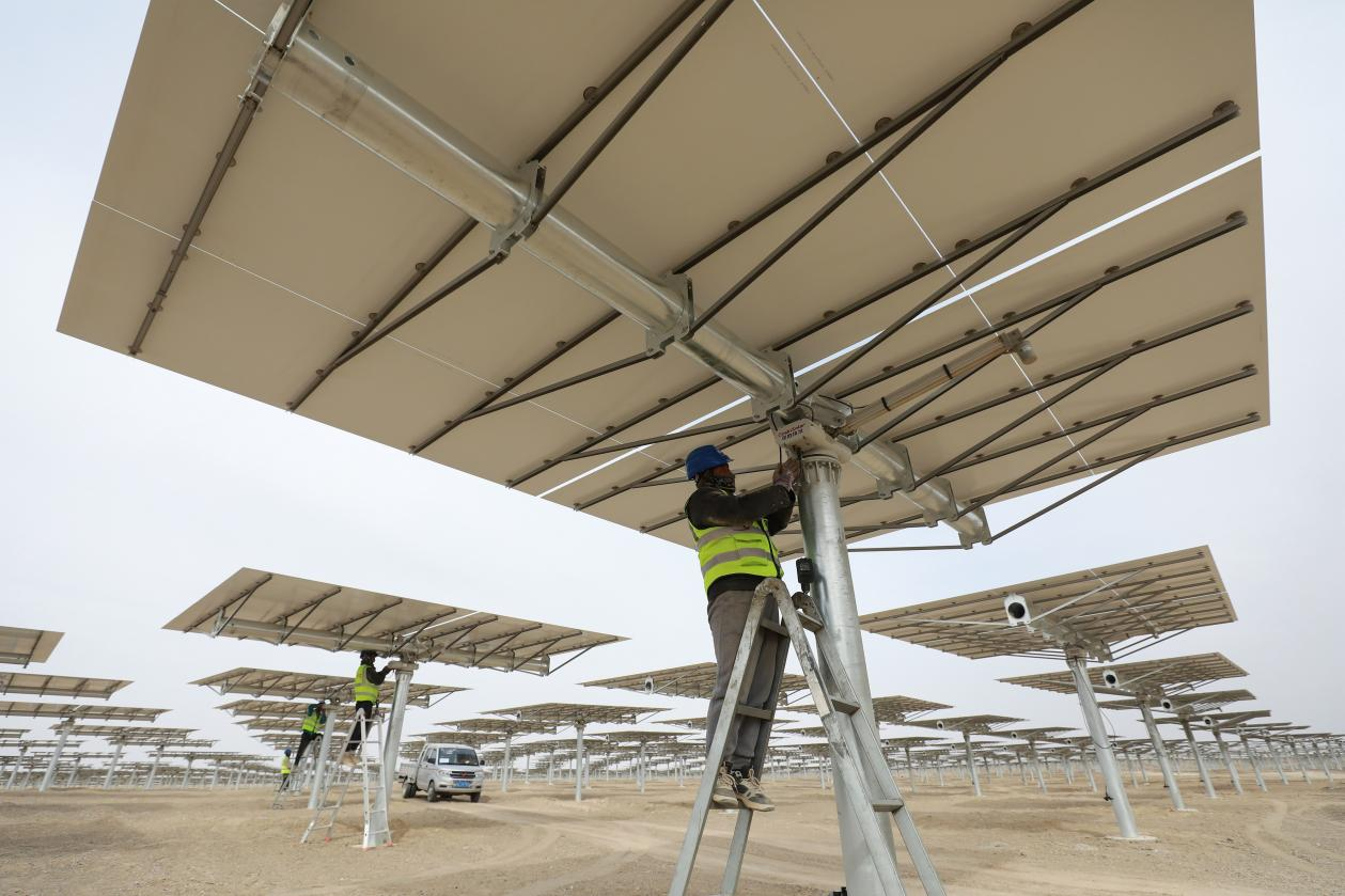 △ 2024年3月12日,甘肅省酒泉市金塔中光太陽(yáng)能10萬千瓦光熱+60萬千瓦光伏項(xiàng)目現(xiàn)場(chǎng),施工人員有序作業(yè)。