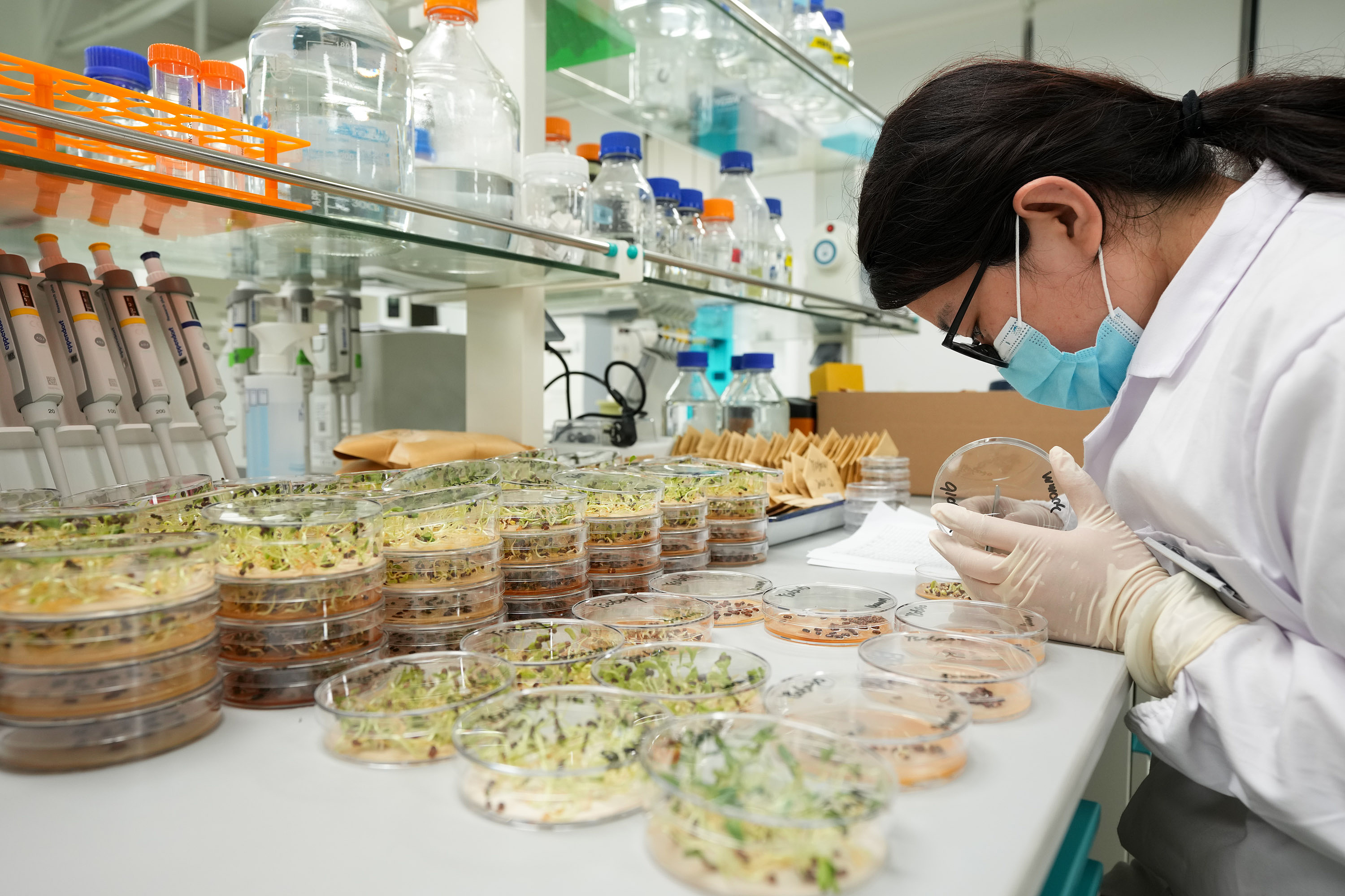△ 海南三亞崖州灣科技城的崖州灣種子實(shí)驗(yàn)室,科研人員正在觀察種子樣本。