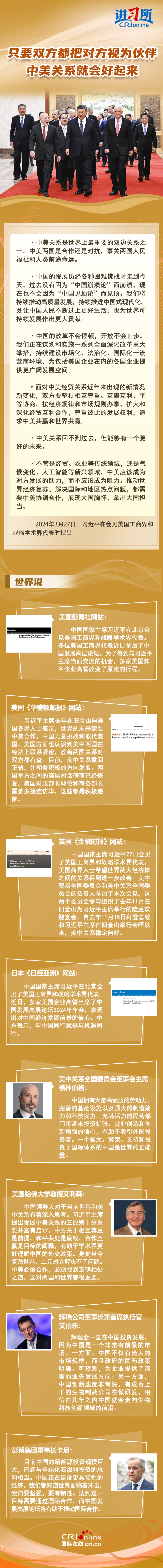 國家主席習(xí)近平27日在人民大會(huì)堂集體會(huì)見美國工商界和戰(zhàn)略學(xué)術(shù)界代表。習(xí)主席在會(huì)見中高屋建瓴地指出,美方應(yīng)同中方相向而行,樹立正確戰(zhàn)略認(rèn)知,保持中美關(guān)系止跌企穩(wěn)的勢(shì)頭,積極探索正確相處之道,推動(dòng)中美關(guān)系持續(xù)穩(wěn)定健康向前發(fā)展。