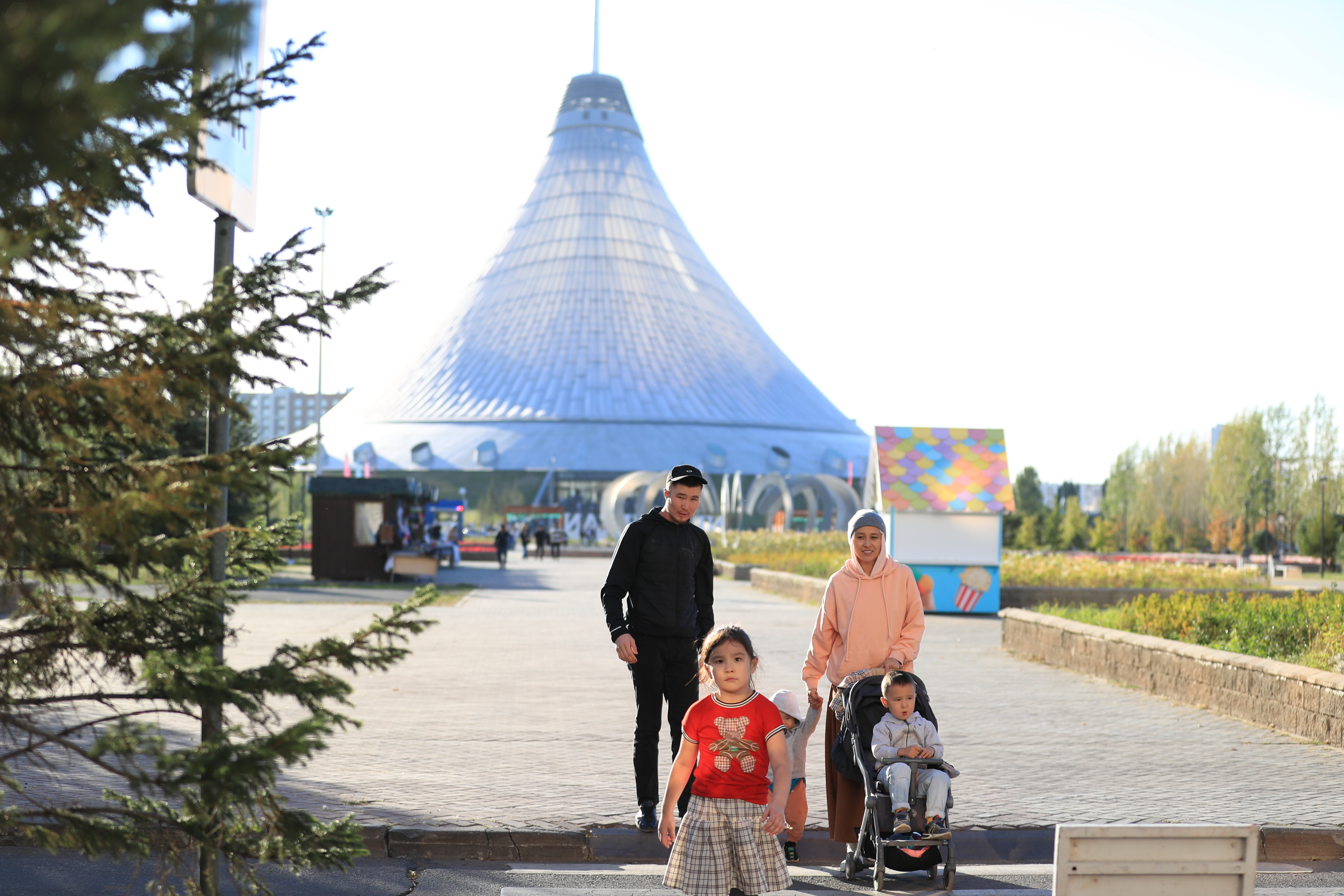 市民走在哈薩克斯坦首都街頭,他們身后是著名的“可汗之帳”購(gòu)物中心。