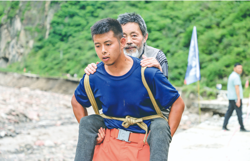 鹽水溪村71歲的村民倪月富,腰以下重度殘疾,行動(dòng)極為不便,被困家中。關(guān)鍵時(shí)刻,村組干部及時(shí)前來(lái)轉(zhuǎn)移。由于轉(zhuǎn)移路線漫長(zhǎng),且沿途存在垮塌狀況,村黨員干部接力背送老人。