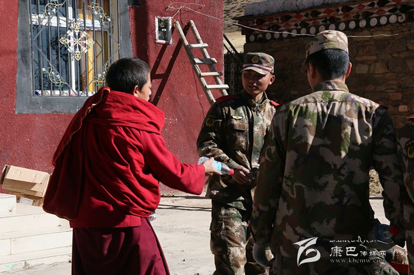27日上午,記者一行來到金龍寺,看見院子里已經(jīng)搭起了一排排整齊的救災(zāi)棉帳篷,當?shù)馗刹亢臀渚俦聫R僧人一道加固帳篷,僧人們從自己的帳篷里抱出礦泉水,送到武警戰(zhàn)士們手中。