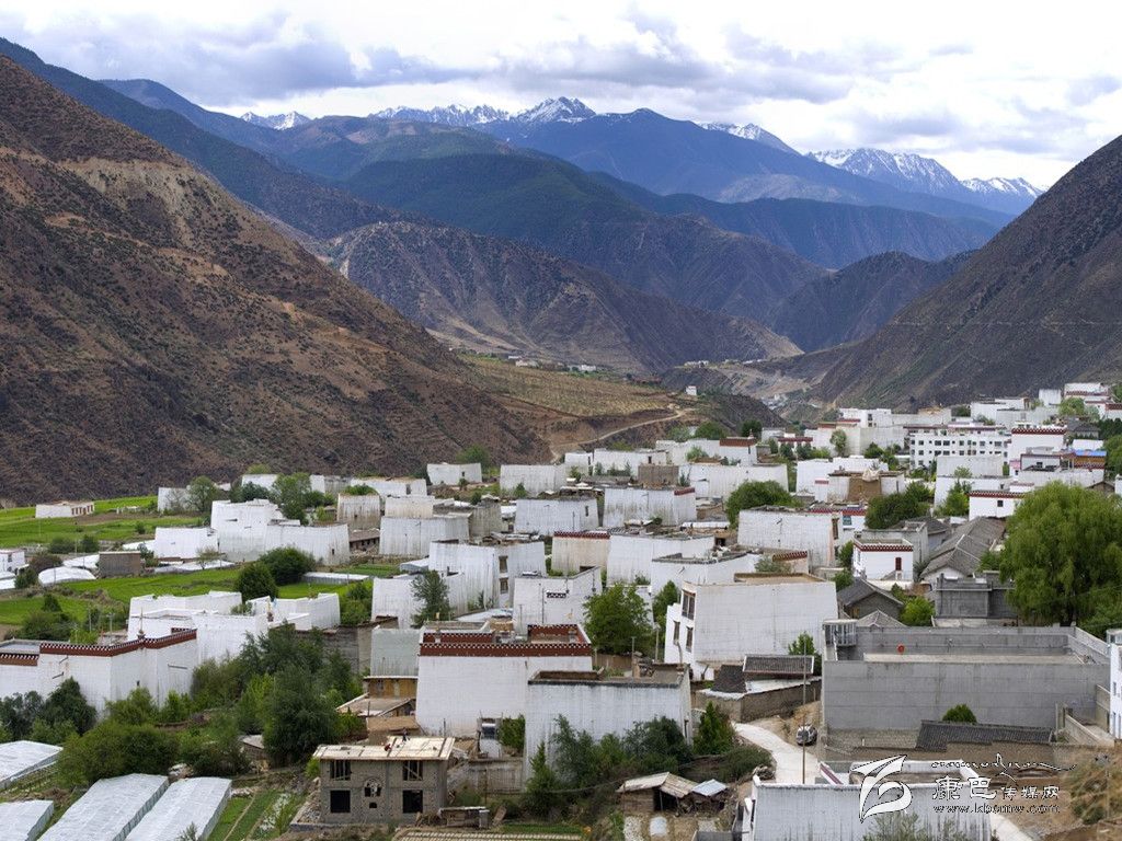 一排排白色藏房掩映在青山綠水中。