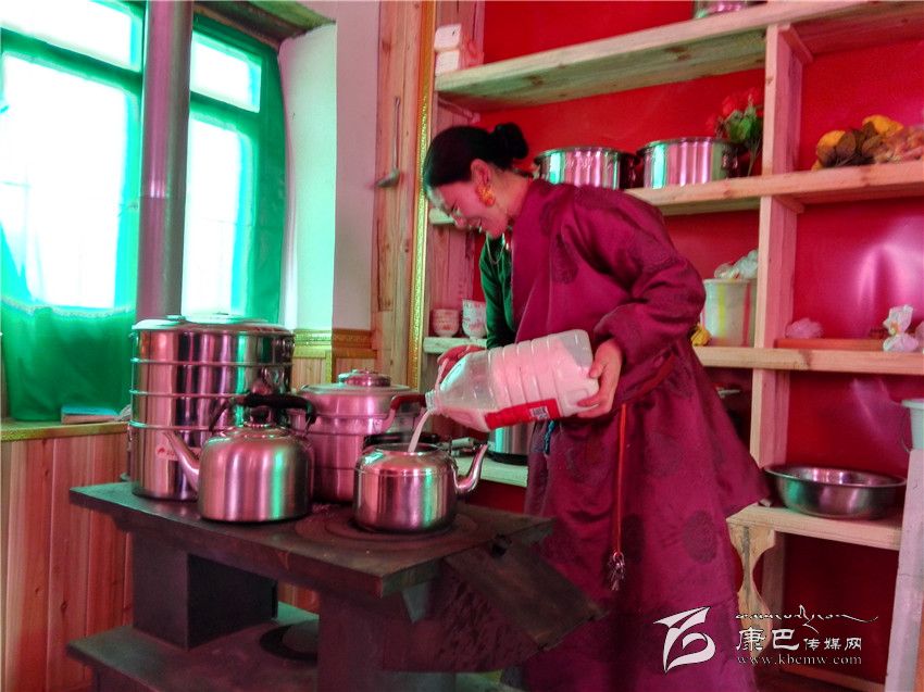 走進江巴達吉的家里,一股熱浪撲面而來,小鋼爐上燒著熱水,幾個女人正在備料準備包酥油包子和牛肉餃子。藏桌上擺滿了糖果、牛肉,豐盛的食物琳瑯滿目。江巴達吉愜意地喝著奶子茶,知足和幸福寫在臉上。