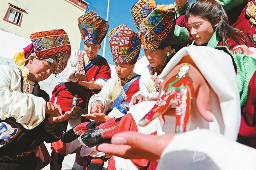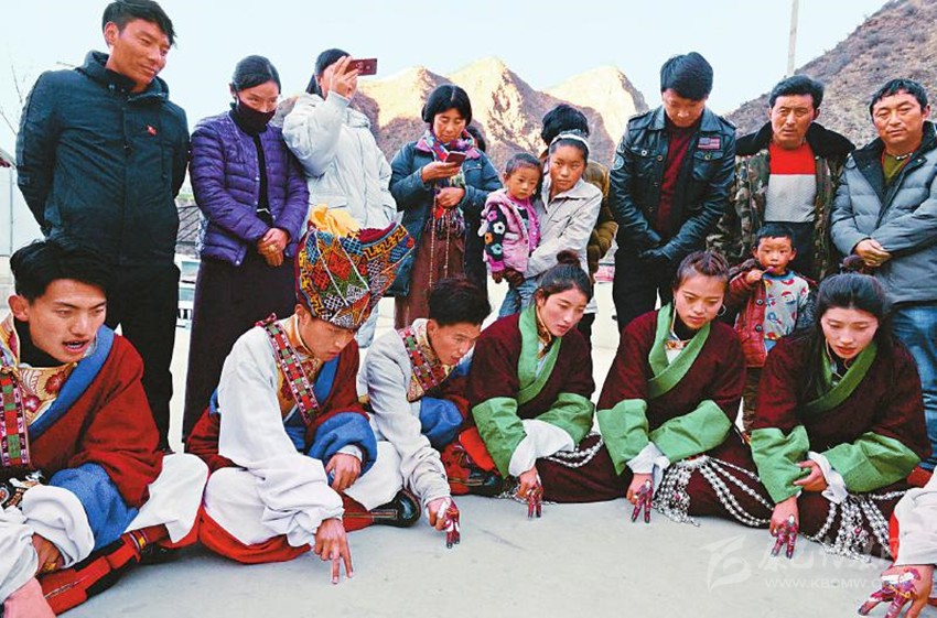 2017年12月22日,白玉縣城陽光普照,縣藝術(shù)團(tuán)一群“90后”藏族演員用顏料相互在食指和中指上熟練地繪制著具有當(dāng)?shù)孛袼滋厣娜宋飯D案。音樂響起,演員們的手指隨著節(jié)拍翩翩起舞,左挪右轉(zhuǎn)。隨著唱詞和曲調(diào)的變化,手指的動(dòng)作幅度和節(jié)奏也隨之變化。藝人的情感起伏、喜怒哀樂被“小人”般的手指表現(xiàn)得淋漓盡致。