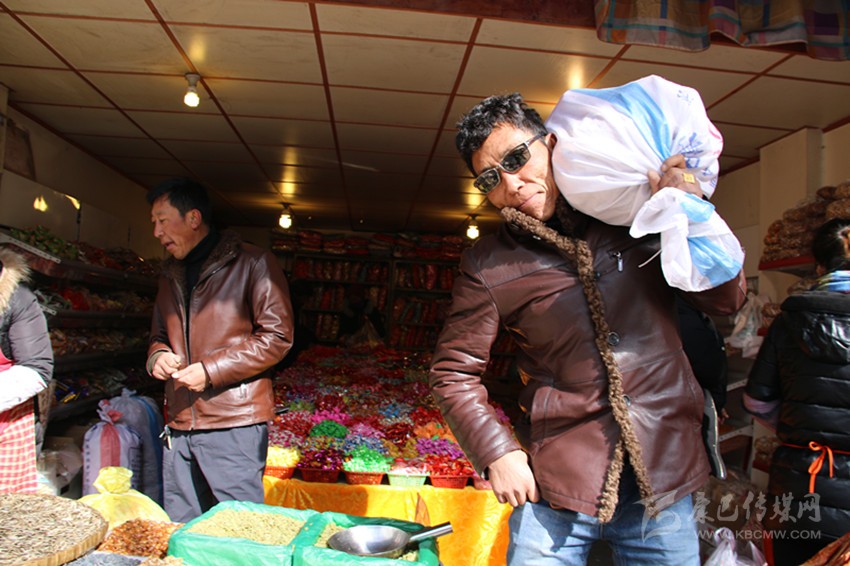 走進郭達橋重康糖果店,洛讓說:“多買點糖果糕點,娃娃老婆喜歡?!比缓笳諉吸c貨:花生10斤、瓜子5斤、葡萄干5斤、水果糖5斤、軟糖5斤、炒米糖10斤……一下就指點了八九種糖果糕點??吹搅诉@樣的生意,老板樂開了花。與洛讓大包大攬的氣派不同,長期經(jīng)商的扎西老練地詢價:“老板,我們買這么多,要優(yōu)惠喲?!币环憙r還價之后,洛讓和扎西買了十種糖果,用去1066元,裝滿整整兩編織袋。洛讓把糖果過扛在肩上,對筆者說:“你來試一下,有點分量,你別說,辦年貨也是一種體力活喲。”
