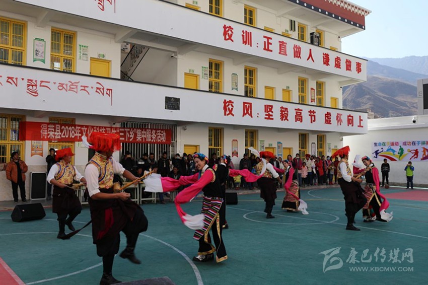 上午11點,歡快的音樂在小學操場上響起,演出正式開始。村民們圍坐在操場上,人頭攢動、彩幡飛舞、陽光正好。13個節(jié)目依次上演,包括男女群舞、女子群舞、男子合唱、女子合唱、男女獨唱,最有特色的是得榮本地特色群舞《雪域鍋莊》和《九步情》。