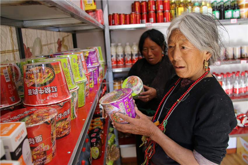 貨架上的貨物琳瑯滿目,價(jià)格與縣城大超市一分不差,還節(jié)省了路途奔波?!凹议T口就能買到東西,還又好又便宜,安逸。開展精準(zhǔn)扶貧,硬是為大家解決了大困難?!?村民格瑪拉措道出了村民們的感激。大家共同商議決定把這超市叫做“洛蝦村感恩超市”。