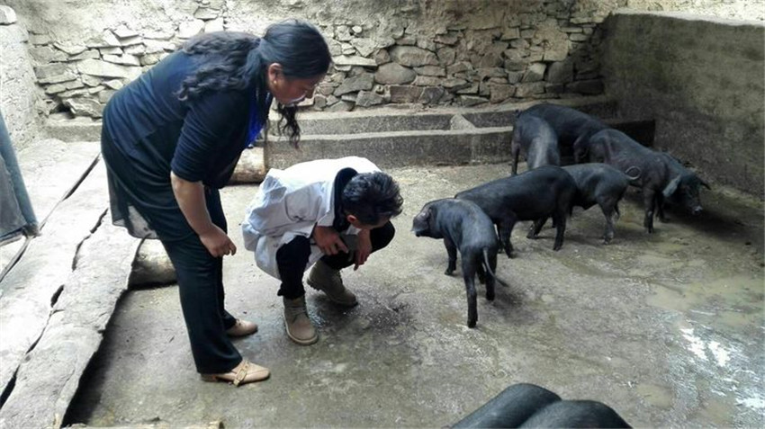 技術(shù)員到養(yǎng)殖戶家查看藏黑豬長(zhǎng)勢(shì)。