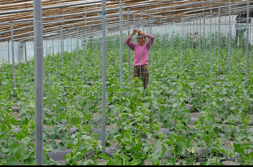為進(jìn)一步做大做強(qiáng)蔬菜產(chǎn)業(yè),瀘定縣穩(wěn)步實(shí)施《高半山特色生態(tài)農(nóng)業(yè)發(fā)展規(guī)劃》,優(yōu)質(zhì)魔芋、高產(chǎn)核桃、特色水果播面分別達(dá)11000畝、9000畝、7120畝;建成現(xiàn)代農(nóng)業(yè)產(chǎn)業(yè)基地8.65萬畝、高產(chǎn)高效創(chuàng)建基地2.4萬畝,蔬菜種植面積達(dá)2.5萬畝,蔬菜基地灌溉保證率達(dá)90%,蔬菜良種、基地綠色防控覆蓋率均達(dá)100%。圖為德威鄉(xiāng)磨子溝村村民在蔬菜大棚內(nèi)忙碌。(尼胡克布 攝影報(bào)道)
