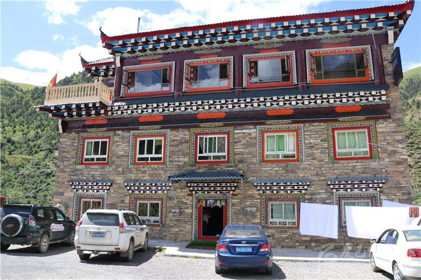 該酒店三樓一底,集餐飲、停車、住宿為一體,設單標間和套房共計22間38個床位,雇傭了3名當?shù)卮迕駧凸?,院內甚至配套了超市和茶樓;藏文化元素俯仰皆是,雕梁畫棟,?guī)模配備,儼已成為全縣鄉(xiāng)鎮(zhèn)一道亮麗風景。不論淡旺季,每間房價188元至258元不等。夏季正值入住高峰期,8月以來,幾乎天天客滿。