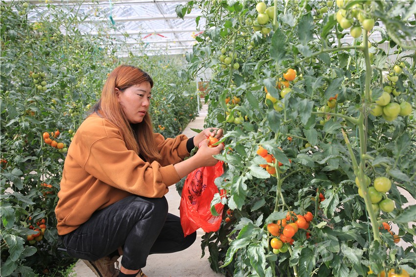 記者來到產(chǎn)業(yè)園的智能溫室大棚,只見里面各種紅的黃的綠的、大的小的番茄,掛滿藤蔓。“基地以種植綠色無公害農(nóng)產(chǎn)品為主,這是我們今年開始試種的小番茄,有十來個(gè)品種,你別看它還是綠色的,其實(shí)已經(jīng)成熟了?!庇浾呓舆^孟凡強(qiáng)摘下的幾個(gè)小番茄,一口咬下,香甜多汁且沁人心脾。孟凡強(qiáng)介紹,這是他們與北京神州綠鵬農(nóng)業(yè)科技有限公司合作,精選引進(jìn)中國航天工程育種的優(yōu)質(zhì)品種。除了番茄,溫室內(nèi)還種有秋葵、辣椒、小葫蘆、僧帽瓜等蔬菜,處處綠意盎然。