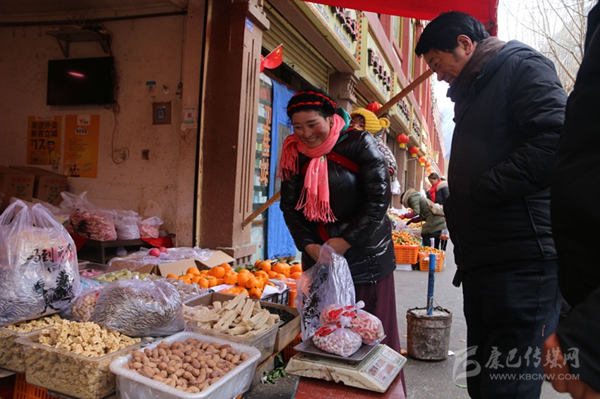 在離李全的鋪面十幾米的地方,副食商販王大姐正忙著給顧客羅繼祥稱雞蛋,羅繼祥是“老康定人”,他說(shuō):“以前過(guò)年都是自己在家里炒花生、炸果子,現(xiàn)在市場(chǎng)上啥子都有,方便多了,出門就能夠買到,到市場(chǎng)上和大家一起購(gòu)年貨,熱鬧、喜慶,有年味兒。”