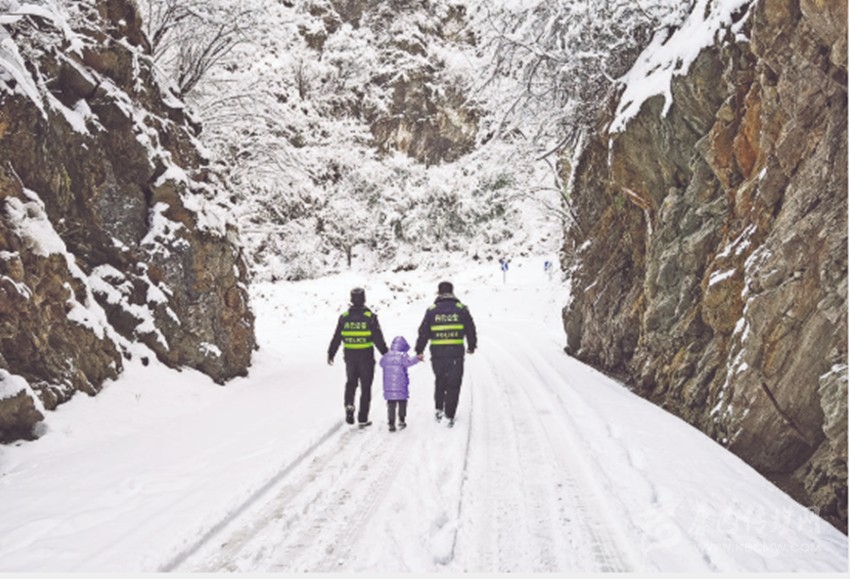 晨間,山谷滿是積雪,氣溫已降至零下。看到頂風冒雪如期而至的民警,原本又驚又怕的受困游客看到了希望??陆鹳F和戰(zhàn)友們一方面安撫他們,另一方面合力將事故車輛移開,并帶領受困人員安全離開事發(fā)區(qū)域。