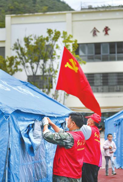9月7日早上7點,“9·5”瀘定地震第3天,磨西古鎮(zhèn)從晨曦中醒來,老街上到處是地震震下的瓦礫和磚塊,足以說明3天前那場地震來得是如此猛烈。在老街路口不遠處的簡愛私房菜餐館門口,“免費簡餐”四個大字十分醒目,李長會將面條倒進滾燙的開水中,用筷子攪拌數(shù)圈,蓋上鍋蓋,幾分鐘后,再用筷子挑出面條,放進早已準備好的一次性紙碗中,這樣的動作她每天要重復(fù)好幾百次。