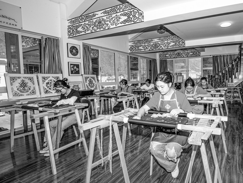 據(jù)烹壩鎮(zhèn)副鎮(zhèn)長王昇介紹,2018年在省州縣婦聯(lián)的大力支持和幫助下,烹壩鎮(zhèn)成立了“指尖藏花貴瓊刺繡”合作社,150余名婦女加入到合作社,參與刺繡。自從成立了合作社,村里的婦女們背著娃,繡著花,養(yǎng)活自己,養(yǎng)活全家?!爸讣獠鼗ㄙF瓊刺繡”合作社的“貴瓊藏繡”已成為烹壩鎮(zhèn)婦女增收的好項目。婦女們有事做了,干群關系也更加緊密,老百姓遇到問題也更加愿意找黨員、找干部。同時“貴瓊藏繡”這種康巴地區(qū)特有的非遺傳承技藝也得到了很好傳承和發(fā)揚。