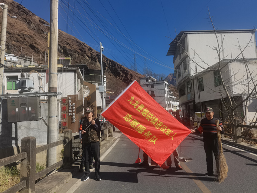 圖為煙袋鎮(zhèn)退役軍人志愿服務隊正在開展志愿服務活動。