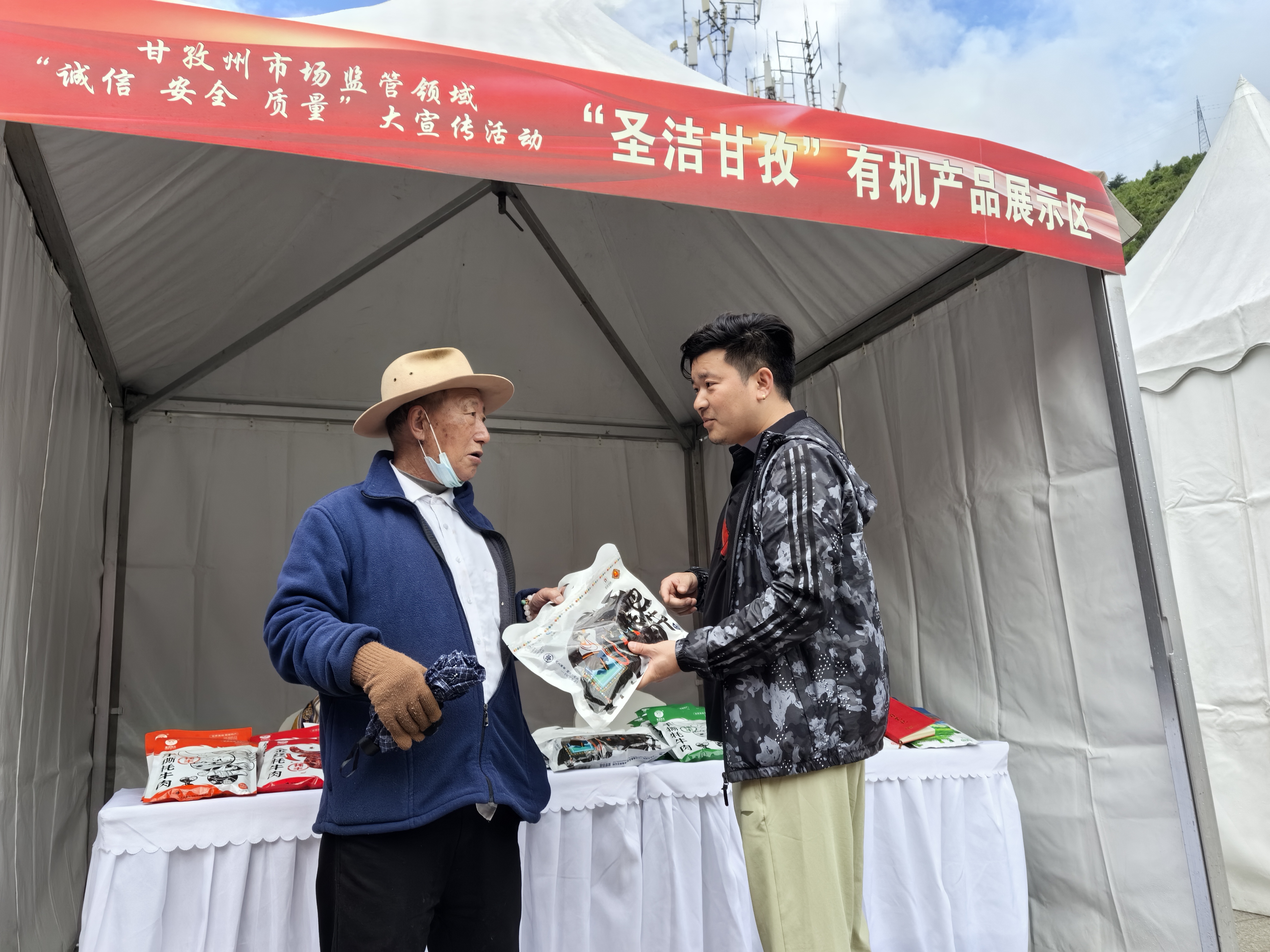 丈夫還未完成支付,妻子已經(jīng)迫不及待地撕開包裝品嘗起來。在“圣潔甘孜”有機(jī)產(chǎn)品展示區(qū),來自西安的游客孔大軍和陳繼霞夫婦買到心儀已久的“甘孜好物”?!皩?duì)甘孜特產(chǎn),我們?cè)瓉碓诰W(wǎng)上有所了解,昨天我們吃了正宗的牦牛肉湯鍋,今天又購買到‘資格’的牦牛肉干,感受到甘孜質(zhì)量建設(shè)的成效,為我們此次旅游留下了美好記憶?!标惱^霞買到“心頭好物”,高興不已。