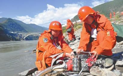 圖為徐驊(右)和戰(zhàn)士在架設(shè)水泵準(zhǔn)備滅火。  (武警四川省森林總隊(duì)甘孜州支隊(duì)供圖)