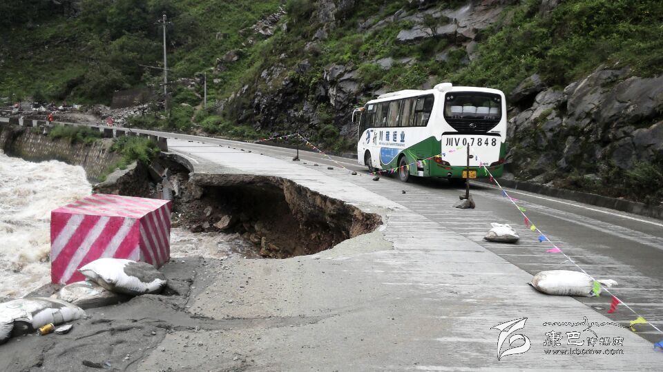 本網(wǎng)訊 (鄧翰卿 賀淑明文/圖)由于連降暴雨,折多河暴發(fā)山洪。9月17日上午7時(shí)20分,瀘定公路分局瓦斯溝養(yǎng)護(hù)站在道路巡查中發(fā)現(xiàn)國道318線二康路小天都路段K2824+800處路基被山洪沖毀,形成缺口。發(fā)現(xiàn)險(xiǎn)情后,該分局第一時(shí)間組織人員對(duì)危險(xiǎn)路段實(shí)行交通管制,安排專人負(fù)責(zé)在缺口上、下方向提示過往行人及車輛,并及時(shí)擬定應(yīng)急搶險(xiǎn)方案。截止目前,路基右側(cè)被沖毀路段長達(dá)45米,寬5.9米,路基被水漩空,道路混凝土面層懸空15米,僅左側(cè)車道勉強(qiáng)通行。因水流湍急,不利于及時(shí)恢復(fù)路基,目前該路段已實(shí)行交通管制,該分局提示過往車輛觀察、緩慢通行水毀路段。