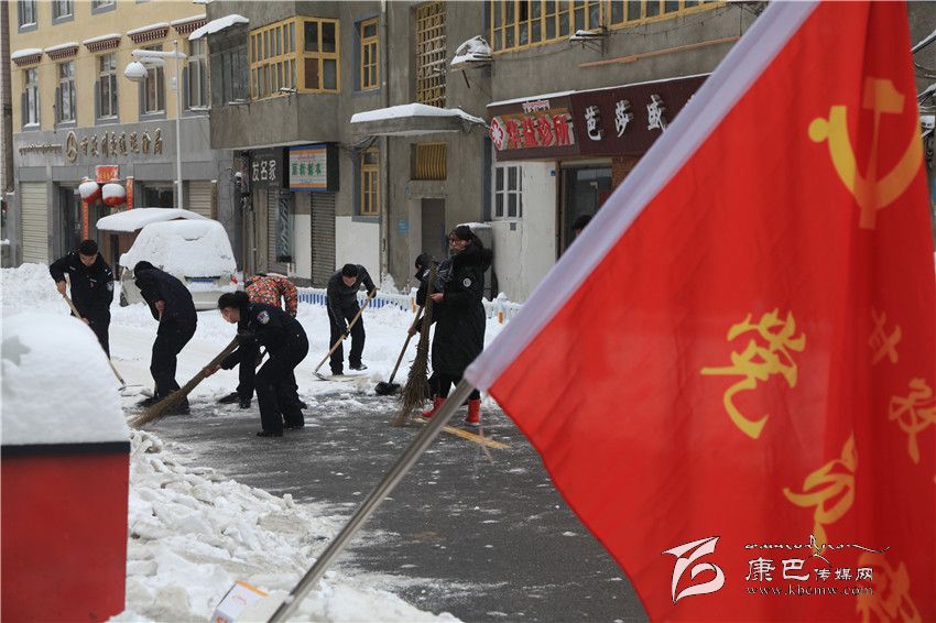 一陣鐵鏟的撞擊聲把記者吸引到了州公安局辦公大樓附近,大雪中,一面寫有黨員突擊隊(duì)字樣的紅旗格外引人注目。經(jīng)過訊問記者得知,這支鏟雪隊(duì)是由州公安局的黨員和民警組成的,因?yàn)橥k姡偌又l(fā)現(xiàn)辦公樓外的街道上積雪太厚,給行車、行人造成了不少麻煩,所以州公安局的黨員、民警組成了這支臨時(shí)突擊隊(duì),分成兩個(gè)小組分頭突擊。在他們身后,已經(jīng)有數(shù)百米街道上的積雪被清除。此外,在將軍橋附近,武警官兵也加入到清理積雪的行列,那道橄欖綠在雪中顯得格外美麗。