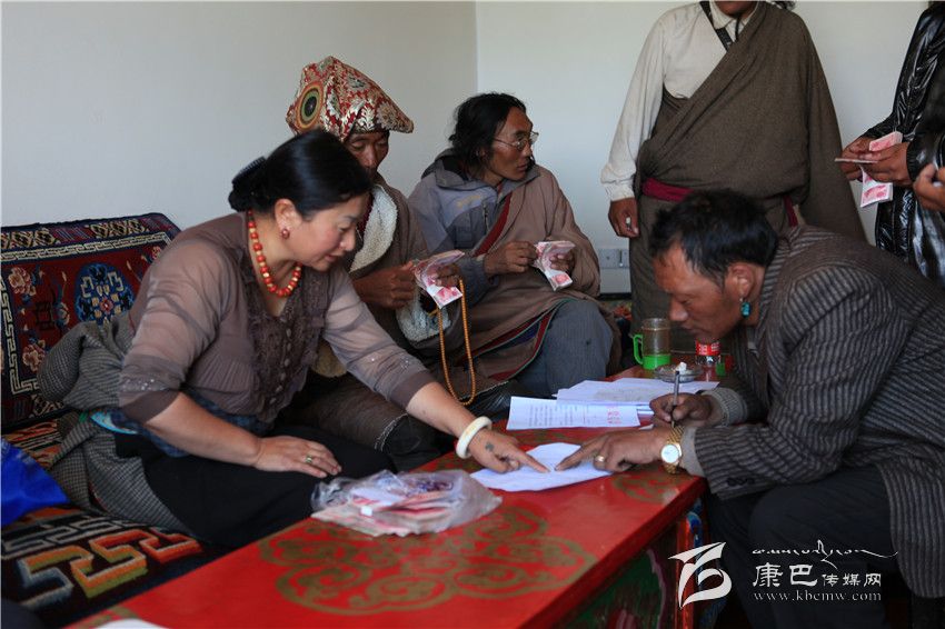 色達(dá)縣基層干部現(xiàn)場(chǎng)兌現(xiàn)易地扶貧搬遷補(bǔ)助款。