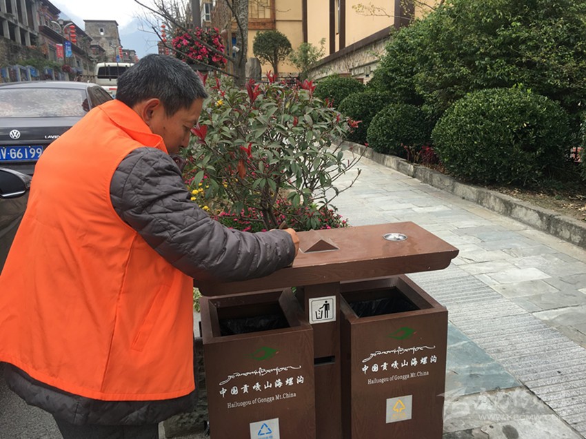 “走,我們到街上逛逛,看看海螺溝的變化?!痹诤B轀暇皡^(qū)管理局政治部主任龔自毅的陪同下記者來(lái)到磨西鎮(zhèn)街上。邊走邊看,記者看見(jiàn)龔自毅只要發(fā)現(xiàn)街上有煙頭或垃圾時(shí),就會(huì)彎腰把這些垃圾撿起來(lái),扔進(jìn)垃圾桶。