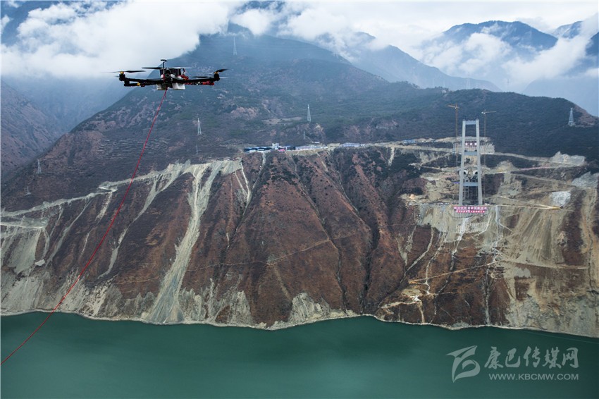 無(wú)人機(jī)將小繩送到對(duì)岸,工作人員再利用小繩拉大繩,最后把鋼繩拉過(guò)大渡河架設(shè)牽引系統(tǒng)。