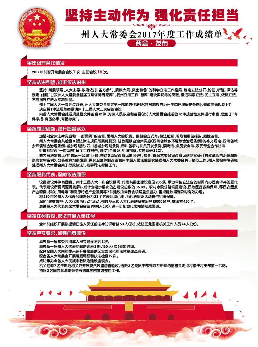 2017年是州十二屆人大常委會各項(xiàng)工作的開局之年,在中共甘孜州委的堅強(qiáng)領(lǐng)導(dǎo)下,常委會圍繞中心,服務(wù)大局,依法履職,圓滿完成了州十二屆人大一次會議確定的各項(xiàng)工作任務(wù)。