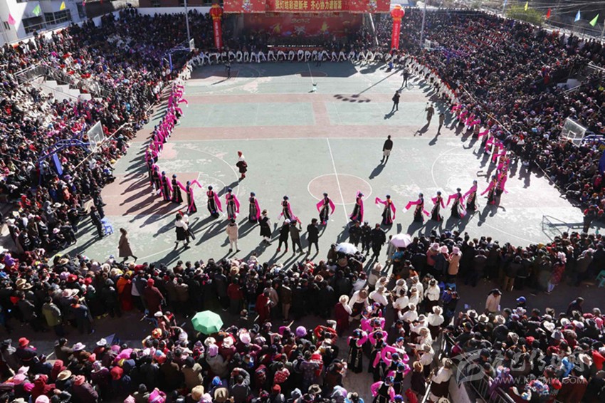 當(dāng)日晚,該縣舉辦新春篝火鍋莊晚會,縣內(nèi)的快樂阿媽、夕陽紅等7支藝術(shù)團(tuán)到場表演,她們身著瘋裝、穿戴華麗,用鍋莊舞共慶佳節(jié)。歡快的旋律、優(yōu)美的舞蹈,吸引了大批市民參與其中,整場晚會氣氛熱烈、其樂融融。